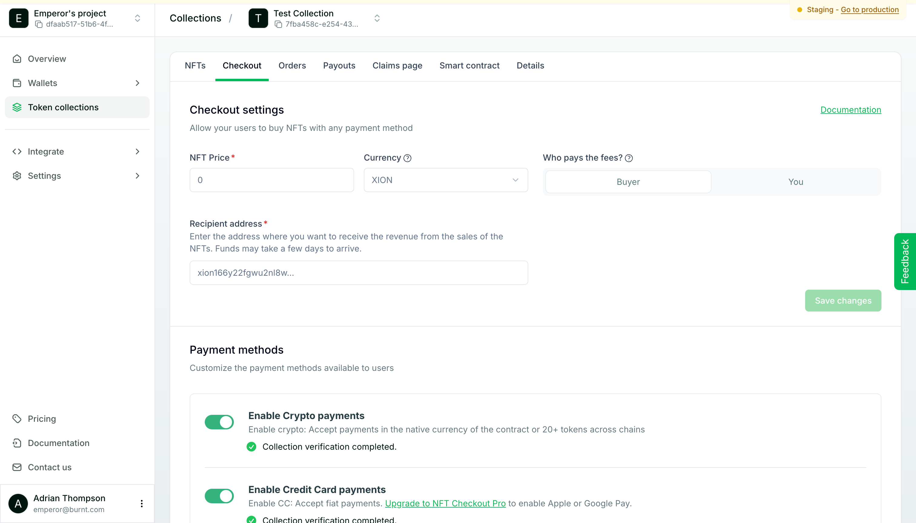 Click the "**Checkout**" tab and make sure the "**NFT Price**" and "**Recipient address**" are filled in and then click "**Save changes**".